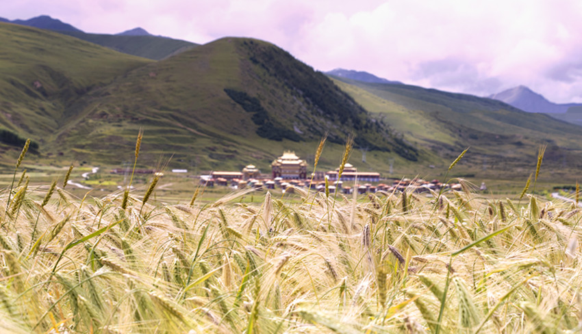 甘孜縣地處橫斷山脈的東北邊緣,康北地區(qū)腹心地帶,雅礱江從這里緩緩流過,肥沃的土壤和無垠的土地總會配上澄徹晴朗的天空。一顆顆飽滿金黃的青稞常在風(fēng)里搖晃著秋天,“康北糧倉”的美在這時展現(xiàn)得淋漓盡致。
