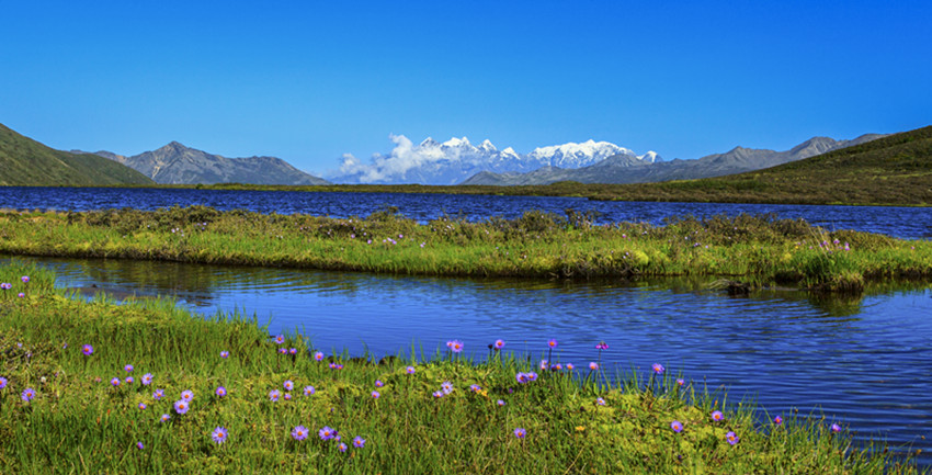 在山谷中穿行十余公里,路面一點(diǎn)點(diǎn)抬起,上了貢嘎山脈,徑直進(jìn)入康定情歌景區(qū)。隨著海拔的升高,涼意漸濃。山依舊是主角,地勢(shì)卻變得平緩而開闊,有茵茵的草地,有大小湖泊,沿途山泉潺潺,野花點(diǎn)綴,空氣清幽,方才單調(diào)的褐色很快被淡忘。山體漸次出現(xiàn)密集而低矮的灌木,枝條筆直地立著,有高寒山區(qū)的凜然之氣。灌木一層層上延,樹木雜多,大片的原始森林漫過山體,將大山包裹起來。遠(yuǎn)處,藍(lán)天白云之下,貢嘎雪山在群峰中探出頭來,擦亮高空的陽光。澄明的空氣里,仿佛可以聽見雪??┛┑匦?。剎那間,仿佛所有的大山,都開始舒展筋骨。