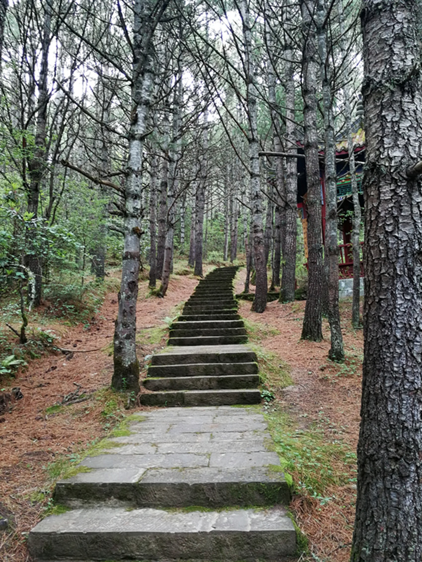 中國民俗有“大年初一不竄門”,這一天,康定人很多都會去寺廟燒香敬佛。前年大年初一,我便去了觀音閣。進門處,有專供燒紙錢的地方。再上階梯,有長列的白色佛塔,進寺就可點燈朝拜。出了觀音閣,我順道去找獅子巖。公路一側(cè)的堡坎已將原來的小徑斬斷,翻上堡坎,小徑幾乎已沒了蹤跡。再仰頭望,獅子巖已是掩映在濃密的綠樹雜叢間。長在右側(cè)的花椒樹,已不見蹤影。幾株高大的白楊樹遮天蔽日,最大的都長到盆口粗了?!鞍倌陿淠尽?,這無疑還是當年那幾棵白楊樹了。我艱難地鉆過荒叢爬到獅子巖腳下,那“祭祀臺”上如過去一樣擺放有貢品,旁邊和樹枝上掛有經(jīng)幡,但周圍仍沒有一絲煙熏火燎過的痕跡。