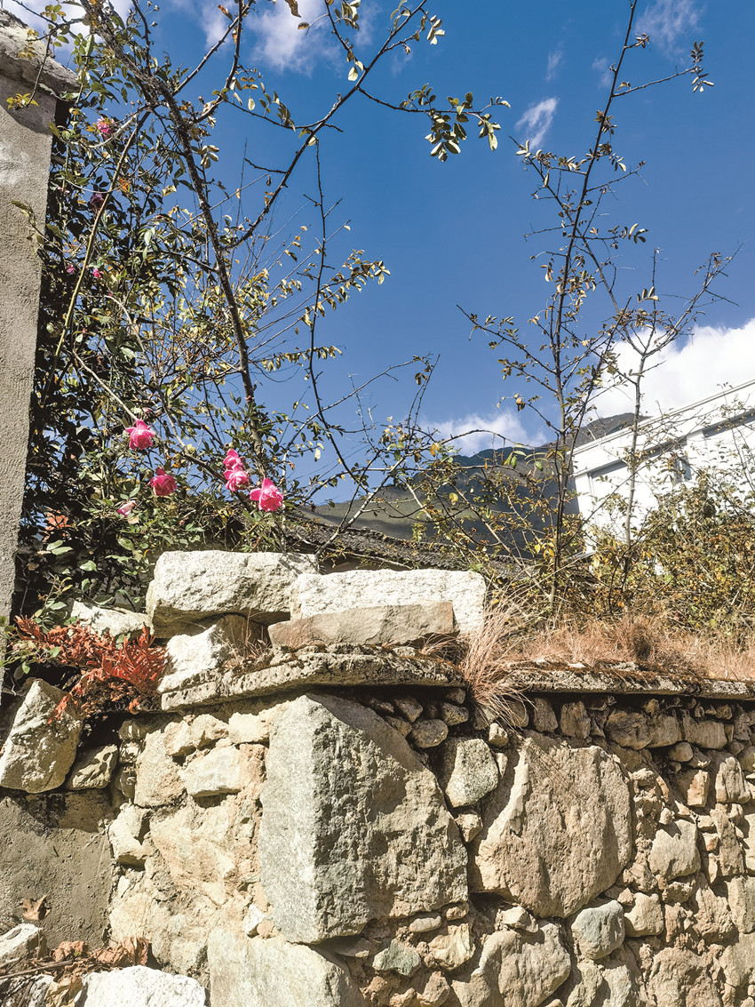 在小飯館里簡單吃了一頓午餐,可惜沒有嵐安豆花,臘肉倒是如大家說的那樣香。吃完飯在村子里漫無目的的轉(zhuǎn)悠,石頭砌的矮墻將每家每戶的房屋圍成院子,墻頭上的草已經(jīng)泛黃枯萎,偶爾有幾枝玫紅色的月季從墻頭伸出來,給石墻點綴了一些色彩和生機(jī)。石墻與石墻之間,是串聯(lián)起每一戶人家的村間小道,經(jīng)過幾戶農(nóng)家,腳下硬化的路面斷了,往前延伸的是窄小的泥路,路兩旁有綠油油的菜地,有收割完的玉米地,有一排排的蘋果樹……往更遠(yuǎn)的地方看去,田地盡頭的山坡上是紅軍紀(jì)念碑,原來這里可以通往紀(jì)念碑,不過目測距離有點遠(yuǎn),收住腳步往回走,沿著村道朝另外一個方向走走看。前面是散落在小山坡上的幾戶人家,比起之前被石墻圍起看不見樣貌的農(nóng)家,山坡上的這些房子錯落有致,清楚的看得見院子的全貌,房屋大多是一層的由石墻瓦頂構(gòu)筑的,每一戶人家都飄揚著鮮艷的紅旗。