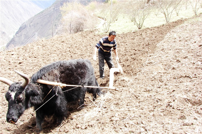 在春播這天,男女老少都穿上節(jié)日的盛裝。給每一頭耕牛的角抹上了油,在陽(yáng)光的照耀下發(fā)出逼人的寒光,牛的頸上,系著一根雪白的哈達(dá),犁鏵也被擦拭得锃光瓦亮的,“架單”(用紅樺做成,成彎曲狀)架在牛的頸上,牛肋兩邊,兩條粗如兒臂的繩索連接著“架單”和犁頭,耕地的男人們將犁鏵插進(jìn)地里,等待儀式的開(kāi)始。