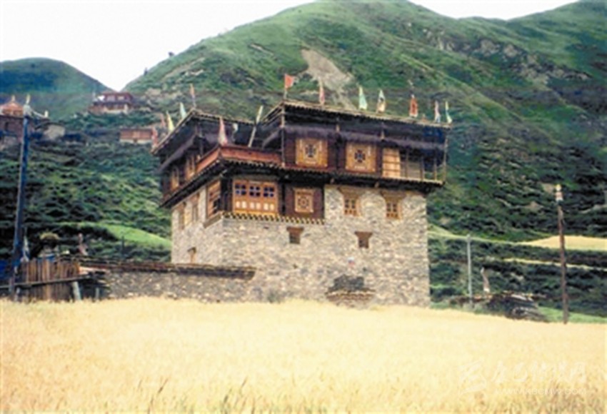 色爾壩藏寨以石頭、泥土、木頭為主要建筑原材料,絕不用水泥、鋼材等現(xiàn)代建材,甚至屋頂也不用瓦片,全部采用泥土,取材十分簡單、方便,然而因?yàn)樾藿ㄈ咳斯?,工期較長,需要2-4個(gè)月或更長時(shí)間。當(dāng)?shù)赝诵莞刹控晠s秋告訴筆者,藏寨房屋層數(shù)有較嚴(yán)格的規(guī)定,普遍為3—4層,不少于3層,也不會高于4層,分別象征一個(gè)人的頭部、胸部、腹部和腿;底層一般用來關(guān)牲畜或堆放雜物,第二層存貯糧食,第三層居住,第四層設(shè)置佛堂,這種建筑風(fēng)格不同于周邊爐霍、道孚、丹巴民居,自成一體。藏寨造型完全擬人化,外形奇特,上大下小呈倒立的品字形,猶如一個(gè)頭戴盔甲、身披戰(zhàn)袍的將軍;房屋上層樓廊外部均以高山柳條垂掛環(huán)繞,以象征大將色爾哇·尼崩達(dá)雅的披肩長發(fā);房頂正中的小旗幟就象將士頭盔上的帽纓;房屋右側(cè)隨風(fēng)飄拂的經(jīng)幡,恰似將軍手握長矛在沖鋒陷陣。房屋依山而建,傍山而立,外形高大雄偉。深厚的格薩爾文化為藏寨蒙上了一層神秘的面紗。