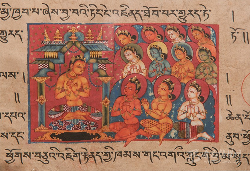 酥油燈點了一天又一年,千載之后墻壁熏得黝黑,曾經(jīng)絢爛無比的丹青圖畫就潛藏在這黝黑里,若隱若現(xiàn);一幀一鋪既是圣者傳奇,也是故國的見證。一頁帶插圖的經(jīng)書陳列在墻角柜子里,看守喇嘛捧與我們頂禮膜拜。經(jīng)書上畫著佛的前世(或某位菩薩)在廟堂上說法,雙手結(jié)說法印、上身著金釧瓔珞、下身著彩裙、跏趺坐于錦墊之上。他目光溫和注視著信眾,講到妙處有金色天花墜落。十一位華美的各色婦人蹲踞于前、雙手合十聆聽;前排三人抬頭看見空中落下的花雨,不禁歡喜贊嘆……
