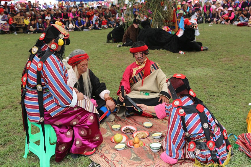 無論是小時候還是現(xiàn)在,“央勒節(jié)”都是我們期盼的節(jié)日,看不懂藏戲,但必須去湊鬧熱,否則這一年就有缺憾。父親作為家中老大,節(jié)前一個月會組織他的兄弟姐妹們開個家庭會議,商議湊錢、做飯、家什等各種細(xì)小瑣事,然后派出家族中幾個壯勞力去“龍王塘”約定束成的地盤上拔草、平地、做記號,表明“德嘎”家族今年還要在這個地方搭帳篷,其他人家看到記號,不會再來占地盤。節(jié)日前一天,稱為“亞堆”,不管有多麻煩,都要在這一天把家搬下去,晚上守帳篷的通常是堂姐夫,做飯洗碗則是我們姐妹們的任務(wù)?!褒埻跆痢庇袃裳蹨厝?,由于水質(zhì)的原因,酥油茶和冒面與自來水做出來的不是一個味兒,非常清香。特別喜歡“央勒節(jié)”之夜,它是一首詠嘆調(diào):浩瀚的星光下,巴楚河的潮汐恢宏豐沛,金沙江在九公里處等待它的匯入;“龍王塘”幾百個帳篷透出光亮,依稀可見人影綽綽,“好風(fēng)如水,清景無限”,巴塘人對閑適生活的追求在這一刻表達(dá)得淋漓盡致。我們期待著藏戲的鼓鈸和唱腔悠揚婉轉(zhuǎn)地傳入帳篷中,做什么都有心情,勁頭十足。