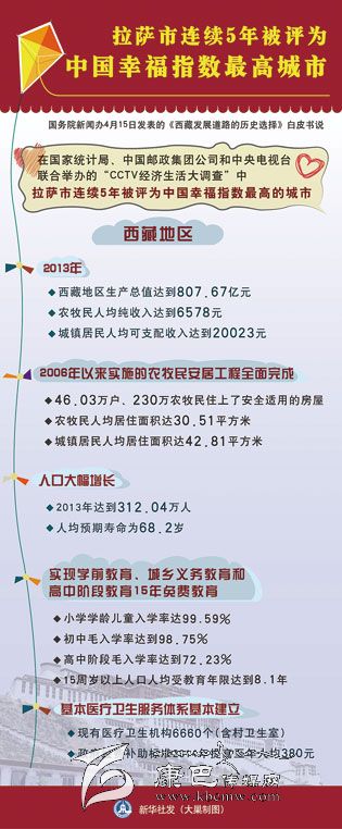 新華社北京4月15日電(記者張曉松、郭麗琨)白皮書說(shuō),西藏絕大多數(shù)人口擺脫了延續(xù)上千年的貧困,基本達(dá)到了小康生活水平。在國(guó)家統(tǒng)計(jì)局、中國(guó)郵政集團(tuán)公司和中央電視臺(tái)聯(lián)合舉辦的“CCTV經(jīng)濟(jì)生活大調(diào)查”中,拉薩市連續(xù)5年被評(píng)為中國(guó)幸福指數(shù)最高的城市。