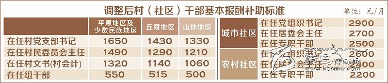 調(diào)整后具體標(biāo)準(zhǔn)為:平原地區(qū)及少數(shù)民族地區(qū),在任村黨支部書記、村民委員會(huì)主任、村文書(村會(huì)計(jì))、組干部,分別為每人每月1650元、1490元、1320元、550元;丘陵地區(qū)分別為每人每月1430元、1290元、1140元、515元;山地地區(qū)分別為每人每月1330元、1210元、1060元、500元。