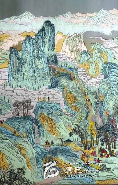 在蜀錦蜀繡展覽館中,由蜀錦大師馬德坤,蜀繡大師鄔學(xué)強(qiáng)共同創(chuàng)作大型錦繡作品《南方絲路圖》,吸引不少游客駐足。該作品天空部分的藍(lán)色由深及淺,并逐步過渡到表現(xiàn)地面的泥金色。同時(shí),利用絲織品的透光性,使遠(yuǎn)山和近景形成強(qiáng)烈對(duì)比,大大地增強(qiáng)了畫面的縱深感。