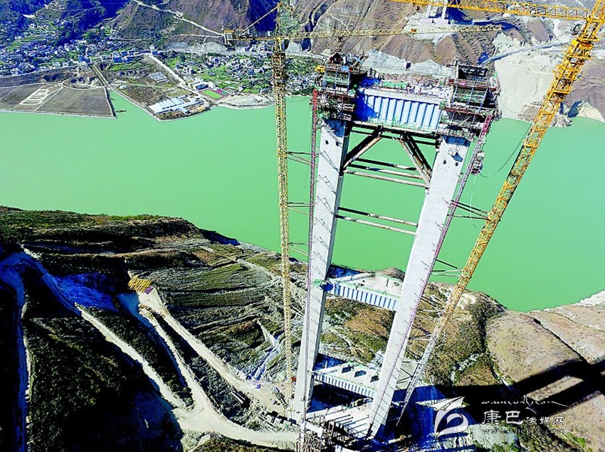 大渡河特大橋全長1411米,主橋是單跨1100米鋼桁梁懸索橋,抗震設計烈度9級,主塔橫梁采用波形鋼腹板,這是全國首個將波形鋼腹板應用于高速公路橋梁索塔橫梁的工程。橋址區(qū)位于3個地震斷裂帶交匯處,處于大渡河干熱河谷,氣象條件多變,瞬時風速最高可達每秒32.6米,相當于12級臺風,施工難度大。為便于施工,施工方從318國道旁借道,建起3.5公里的便道,可從山頂?shù)竭_墩底建設點。受地形限制,便道呈“之”字形折返往上,成為一道獨特的景致。僅修建這條便道就挖了近12萬立方米土,若壘起來,相當于一個長100米、寬100米、高12米的巨型建筑。