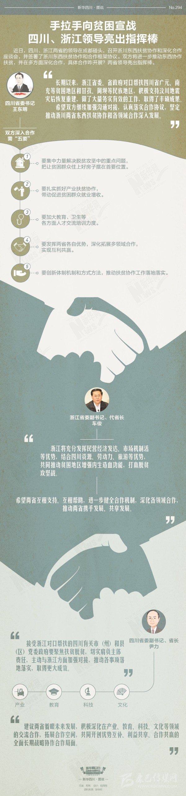 近日,四川、浙江兩省的領(lǐng)導(dǎo)在成都碰頭,召開浙川東西扶貧協(xié)作和深化合作座談會,并簽署了浙川東西扶貧協(xié)作和合作框架協(xié)議。雙方將進(jìn)一步推動?xùn)|西協(xié)作扶貧,并在多方面深化合作,具體合作咋開展?兩省的領(lǐng)導(dǎo)亮出指揮棒。