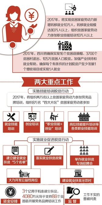 2017年,四川要“確保實現(xiàn)16個貧困縣摘帽、3700個貧困村退出、105萬貧困人口脫貧。加強產(chǎn)業(yè)扶持和就業(yè)幫助,確保每個有條件的計劃脫貧戶至少發(fā)展1個增收項目或?qū)崿F(xiàn)1人就業(yè)”的目標。
