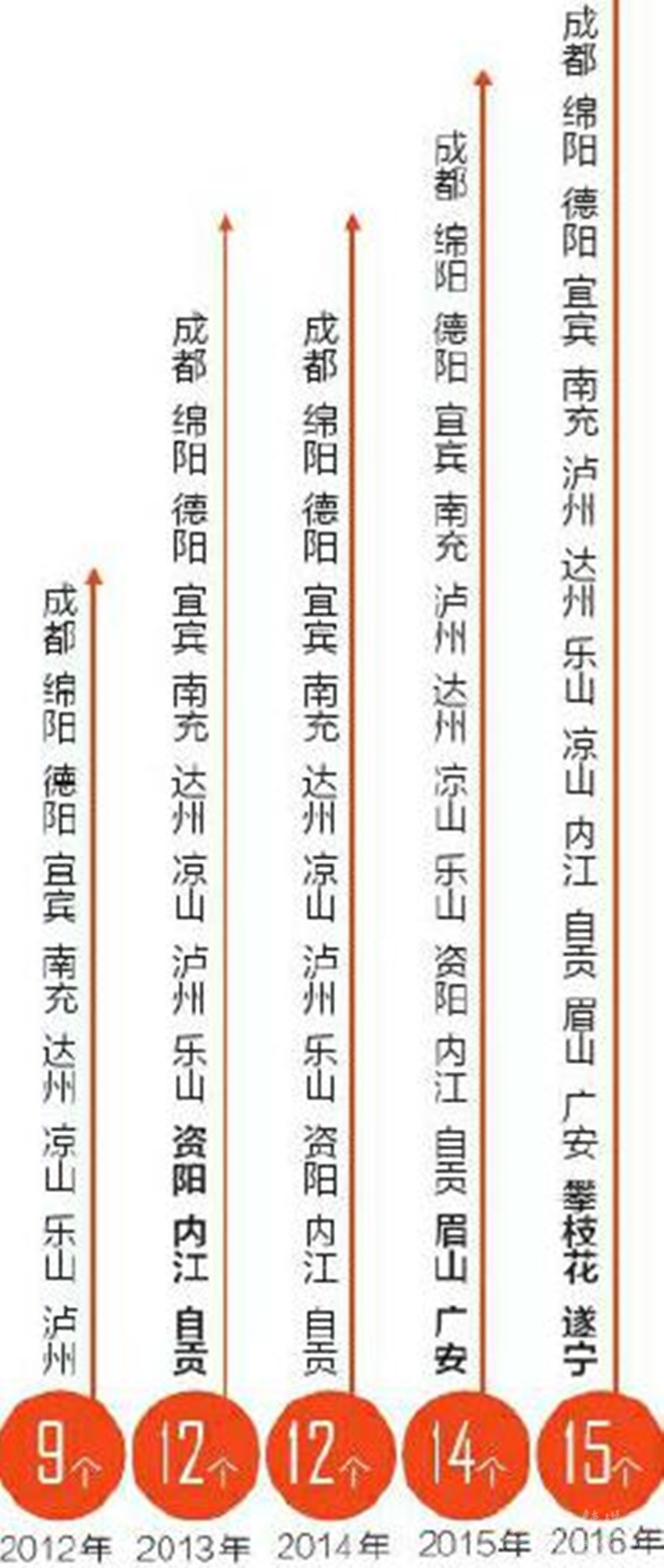 2012年,全省GDP過(guò)千億的市州只有9個(gè),到2016年已經(jīng)達(dá)到15個(gè)。除成都外,14個(gè)市州都在1000億元到2000億元之間,相鄰兩個(gè)市州的平均差距只有60億元左右,最大差距不到100億元,最小差距只有1億多元。