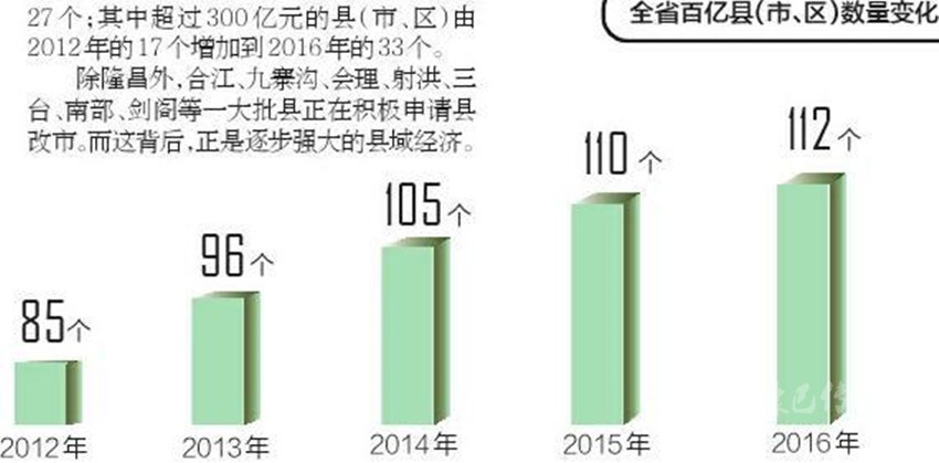 放眼全省,2016年,GDP突破百億元大關(guān)的縣(市、區(qū))112個(gè),比2012年增加27個(gè);其中超過(guò)300億元的縣(市、區(qū))由2012年的17個(gè)增加到2016年的33個(gè)。