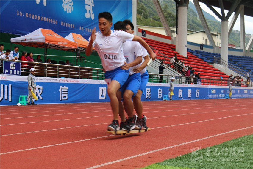 昨(5)日,在康定北門體育場舉行的男子板鞋競速項目的現場,記者看到,參加板鞋競速的各代表團的三名運動員將腳套在一雙板鞋上,第一名隊員揮動著手臂,后二名隊員扶著前面隊員的腰,步調一致地行進著。