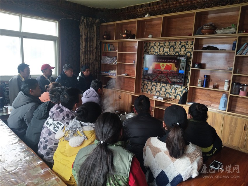 爐霍縣新都鎮(zhèn)望果社區(qū)的活動(dòng)室里,社區(qū)群眾正聚精會(huì)神地收看中央電視臺(tái)直播的慶祝改革開(kāi)放40周年大會(huì)。