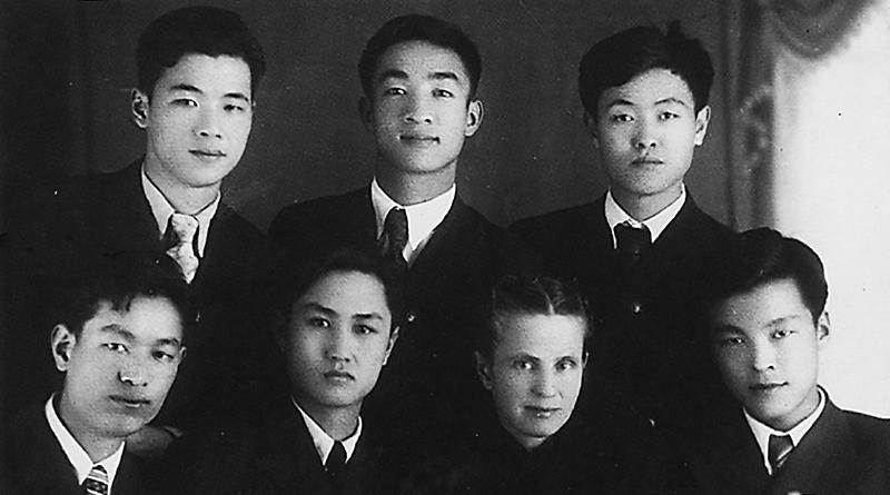 1949 年 6月1日,李鵬同志(后排左)在蘇聯(lián)伊萬諾沃動(dòng)力學(xué)院補(bǔ)習(xí)數(shù)理化及俄文時(shí)與俄語教師費(fèi)德洛娃(前排左三)及同學(xué)合影。 新華社發(fā)