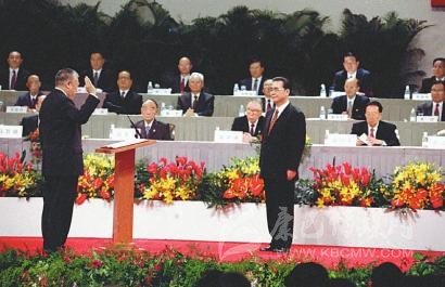 1998年5月5日,全國(guó)人民代表大會(huì)澳門特別行政區(qū)籌備委員會(huì)在北京人民大會(huì)堂宣告成立并舉行第一次全體會(huì)議。這是李鵬同志為籌備委員會(huì)副主任委員何厚鏵頒發(fā)任命書。 新華社記者 鞠鵬 攝