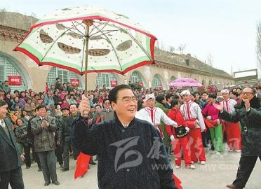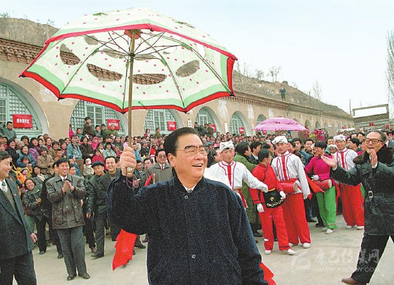 1996年2月19日至20日,李鵬同志回到闊別50年的延安,看望、慰問延安地區(qū)的干部群眾,和老區(qū)人民一起過年。這是大年初一,李鵬同志同棗園村秧歌隊(duì)一起扭起陜北大秧歌。新華社記者 劉建國(guó) 攝