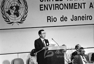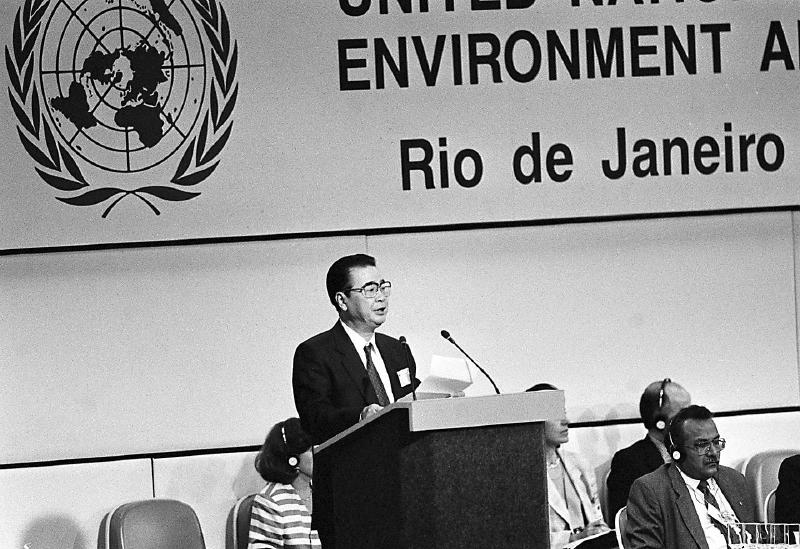 1992 年 6月12日,李鵬同志在聯(lián)合國(guó)環(huán)境與發(fā)展大會(huì)首腦會(huì)議上發(fā)言。 新華社記者 李生南 攝