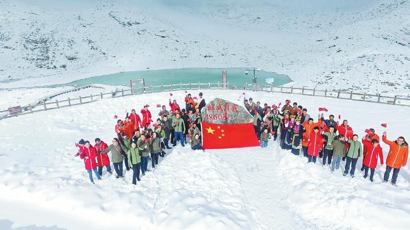 達古冰川管理局干部職工在海拔4860米的雪山之巔舉行“升國旗、唱國歌、慶國慶”活動。銀琪攝