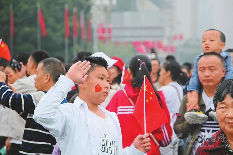 在廣元,雖然天空飄著小雨,但上百名黨員干部和市民自發(fā)聚集在市政府廣場。雄壯的國歌聲中,目送五星紅旗冉冉升起后,現(xiàn)場爆發(fā)出熱烈的歡呼聲。升旗儀式結(jié)束后,廣元市委組織部年輕干部趙志浩請同事為自己和父親拍了3張合影。作為當?shù)匾M的人才,他第一次在廣元參加國慶升旗活動,“見證共和國70華誕,也激勵我為廣元發(fā)展貢獻力量?!?/p>