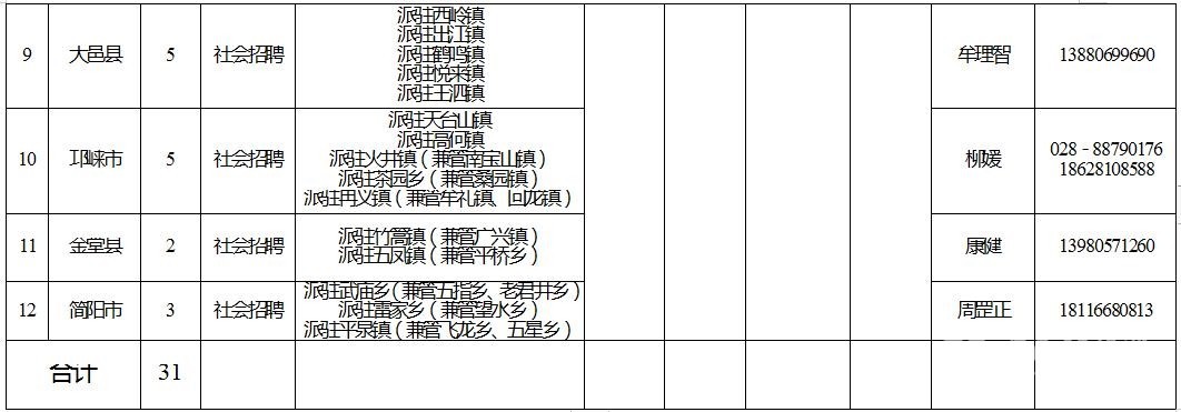 1﹒社會招聘招募區(qū)(市)縣:成都天府新區(qū)、新都區(qū)、郫都區(qū)、簡陽市、都江堰市、彭州市、邛崍市、崇州市、金堂縣、新津縣、大邑縣、蒲江縣(具體信息詳見附件1)。