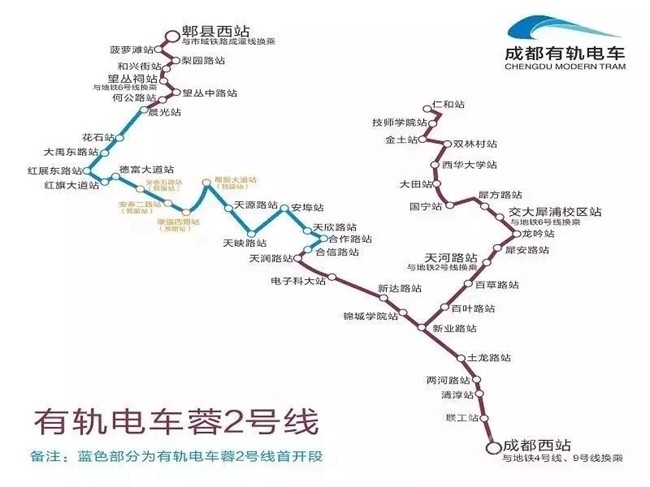 有軌電車蓉2號(hào)線工程線路呈Y型布局,線路經(jīng)過青羊區(qū)、金牛區(qū)、高新西區(qū)、郫都區(qū),線路全長39.3km。其中首開段起于合信路站,止于晨光站共計(jì)13.7km,已于2018年12月26日開通,非首開段長度共計(jì)25.6km。