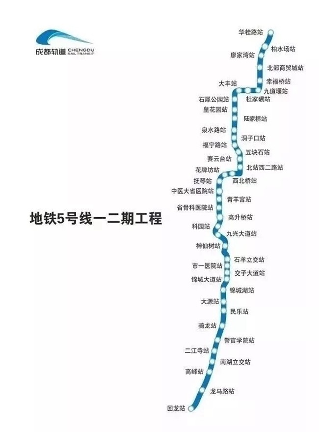 5號(hào)線一二期線路全長49.02km,設(shè)車站41座,其中地下站36座,高架站5座,換乘站4座(5號(hào)線開通時(shí))。其中,一期工程由華桂路向南引出至騎龍站,二期工程由騎龍站向南引出至回龍站。