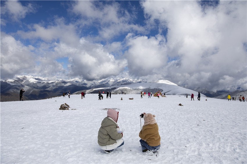 圖為在318國(guó)道四川卡子拉山埡口,游人在雪地里留影、嬉戲。