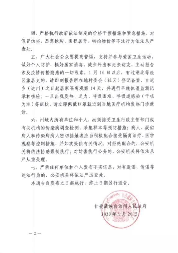 2020年1月24日,我州已全面啟動突發(fā)公共衛(wèi)生事件I級應(yīng)急響應(yīng)。根據(jù)《中華人民共和國突發(fā)事件應(yīng)對法》《中華人民共和國傳染病防治法》《突發(fā)公共衛(wèi)生事件應(yīng)急條例》等法律法規(guī),為確保人民群眾生命安全和身體健康,現(xiàn)就加強我州新型冠狀病毒感染的肺炎聯(lián)防聯(lián)控工作有關(guān)事宜通告如下。一、自本通告發(fā)布之日起,全州所有旅游景區(qū)景點、圖書館、文化館、博覽館、電影院、歌舞娛樂場所、洗浴場所、網(wǎng)吧、宗教活動場所等人員密集場所暫停營業(yè)(或?qū)ν忾_放),并暫停涉旅企業(yè)組織的團隊旅游活動。二、疫情防控期間,一律取消或延遲集會展覽、文化體育、集體宗教活動等群眾性聚集活動。禁止任何集體、個人和餐飲服務(wù)單位舉辦任何形式的群體性聚會、聚餐活動。如遇婚禮請取消或延遲舉辦;喪事一律從簡并嚴格控制參加人數(shù)、落實防控措施。餐飲服務(wù)單位、鄉(xiāng)廚和專業(yè)加工團隊不得承辦群體性聚餐宴席(包括農(nóng)村壩壩宴)。三、關(guān)閉活禽交易宰殺市場,禁止在集貿(mào)市場銷售、宰殺活禽和從事野生動物捕獵、交易,野生動物飼養(yǎng)繁育場所應(yīng)當實施隔離措施,禁止餐飲服務(wù)單位和個人使用野生動物加工、制售食品。四、嚴格執(zhí)行政府依法制定的價格干預(yù)措施和緊急措施,對假冒偽劣、惡意搶購、囤積居奇、哄抬物價等不法行為依法從嚴查處。五、廣大社會公眾要提高警惕,支持并參與愛國衛(wèi)生運動,做好個人防護,搞好居家消毒,減少外出和走親訪友,主動報告涉及疫情傳播隱患的一切線索。1月10日以后,有過湖北等疫區(qū)旅居史的,請即刻報告所在地村委會(社區(qū))登記備案,自返鄉(xiāng)(進州)之日起居家隔離觀察14天,并進行早晚體溫監(jiān)測記錄和核驗;一旦出現(xiàn)發(fā)熱、乏力、呼吸困難、呼吸道感染(干咳為主)等癥狀,請立即佩戴口罩就近到當?shù)蒯t(yī)療機構(gòu)發(fā)熱門診就診。六、州域內(nèi)所有單位和個人,必須接受衛(wèi)生行政主管部門或有關(guān)機構(gòu)的傳染病調(diào)查檢測、采集樣本等預(yù)防措施;病人、疑似病人和傳染病病人密切接觸者應(yīng)當積極配合接受隔離治療、醫(yī)學(xué)觀察等控制措施,并如實提供有關(guān)情況。對拒絕配合的,公安機關(guān)將依法協(xié)助強制執(zhí)行;對妨害執(zhí)行公務(wù)的,公安機關(guān)將依法從嚴從重處理。七、嚴禁任何單位和個人發(fā)布不實信息,對有造謠、傳謠等違法行為的,公安機關(guān)將依法嚴厲查處。本通告自發(fā)布之日起施行,終止日期另行通告。