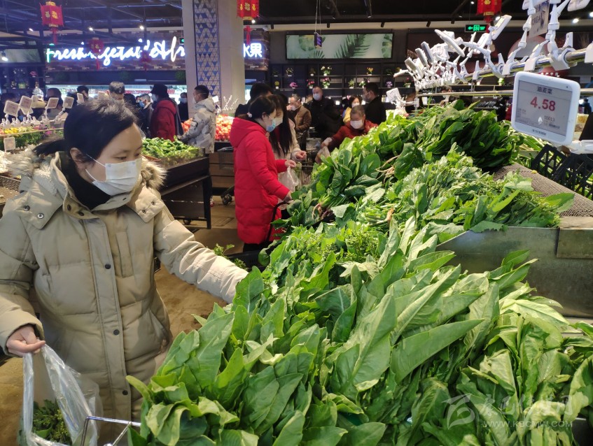 生鮮區(qū)域人流最為集中,放眼望去,貨架上的水果、蔬菜堆得滿滿當(dāng)當(dāng)。個(gè)別貨架空了,工作人員立即上前補(bǔ)上。買了近2塊錢1斤的菜心、近5塊錢1斤的生菜,張超宇表示價(jià)格“還行”,“春節(jié)期間,往年可能也差不多嘛。”