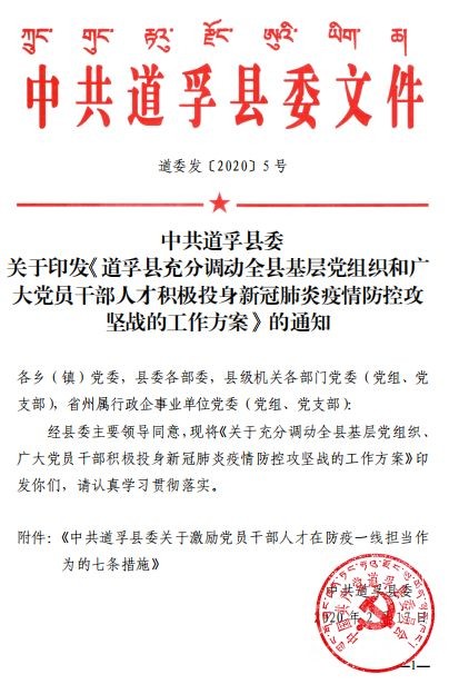 疾風(fēng)知?jiǎng)挪荩迨幾R誠臣。自新型冠狀病毒肺炎疫情防控阻擊戰(zhàn)打響以來,道孚縣各級黨組織和黨員、干部主動(dòng)擔(dān)當(dāng)作為,積極投入疫情防控最前線,為有力防控疫情蔓延作出重要貢獻(xiàn)。近日,道孚縣委印發(fā)《中共道孚縣委關(guān)于激勵(lì)黨員干部人才在防疫一線擔(dān)當(dāng)作為的七條措施》,關(guān)心關(guān)愛、激勵(lì)引導(dǎo)廣大黨員、干部、各類人才在疫情防控一線履職盡責(zé)、擔(dān)當(dāng)作為、安心戰(zhàn)斗。