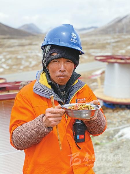 “5分鐘不吃完,飯菜就全涼了?!币晃皇┕と藛T說,在海拔4000米以上的施工一線,他們已經(jīng)習慣了這樣的吃飯速度。