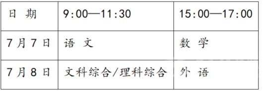 全省高考(一類模式高考除外)于7月7、8日統(tǒng)一組織進行。各科目考試時間(北京時間)安排如下: