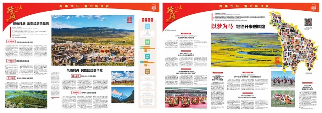 開篇連版以手繪甘孜建州70周年10件大事記鋪底,部分金山、碉樓等民族元素做點(diǎn)綴。版面上有州委州政府的署名文章,還有川報(bào)首席記者所寫《光輝歲月 砥礪奮進(jìn)》70年綜述,并鏈接二維碼,可通過手機(jī)掃碼看甘孜70年變遷。