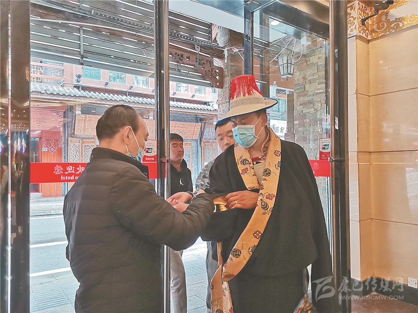 色達(dá)縣演出隊入住邦金麥朵酒店。每天,酒店安保人員多扎準(zhǔn)時出現(xiàn)在門口,提醒演職人員測量體溫、佩戴口罩。“我是酒店的第一關(guān)卡,拉姆是第二關(guān),我倆相互配合,表演節(jié)目的客人住得放心,演出的節(jié)目才會更加精彩?!蹦弥w溫槍,多扎一臉自豪地說。