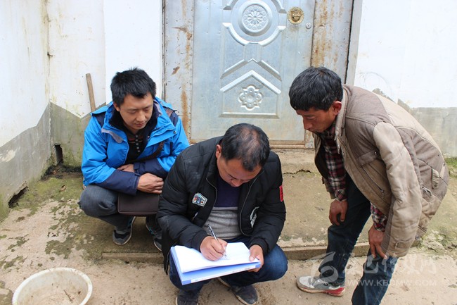 牟爾古(中)入戶(hù)核實(shí)收入、登記年輕人的基本信息。受訪者供圖