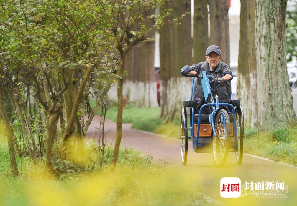 老人四肢殘缺,騎著特制的手搖三輪車,也能行動自如。距離老人被截肢已經(jīng)70年了,他早已學會獨立生活。