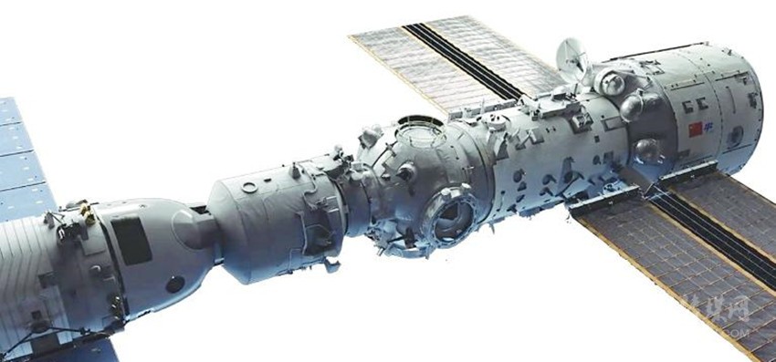 15時(shí)54分,飛船采用自主快速交會對接模式,成功對接于天和核心艙前向端口,與此前已對接的天舟二號貨運(yùn)飛船一起構(gòu)成三艙(船)組合體,歷時(shí)約6.5小時(shí)。