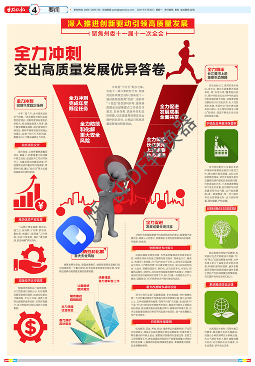 全會(huì)強(qiáng)調(diào),當(dāng)前和今后一個(gè)時(shí)期,全州上下要把深入學(xué)習(xí)宣傳貫徹黨的十九屆五中全會(huì)、中央第七次西藏工作座談會(huì)、中央民族工作會(huì)議、省委十一屆九次全會(huì)和州委十一屆十一次全會(huì)精神作為一項(xiàng)重要政治任務(wù),圍繞建成川西北生態(tài)示范區(qū)綠色發(fā)展科技支撐體系,進(jìn)一步發(fā)揮政策激勵(lì)作用、優(yōu)化創(chuàng)新管理服務(wù)、壓緊壓實(shí)工作責(zé)任,全力推動(dòng)創(chuàng)新發(fā)展成勢(shì)見效。要全力沖刺完成年度既定任務(wù),狠抓項(xiàng)目投資,加強(qiáng)經(jīng)濟(jì)運(yùn)行調(diào)度,加快推動(dòng)優(yōu)勢(shì)產(chǎn)業(yè)發(fā)展;全力防范和化解重大安全風(fēng)險(xiǎn),常態(tài)推進(jìn)疫情防控,統(tǒng)籌推進(jìn)各方面安全工作,全力促進(jìn)發(fā)展成果全民共享,織密民生保障網(wǎng);筑牢長江黃河上游重要生態(tài)屏障,堅(jiān)定不移走生態(tài)優(yōu)先綠色發(fā)展之路。