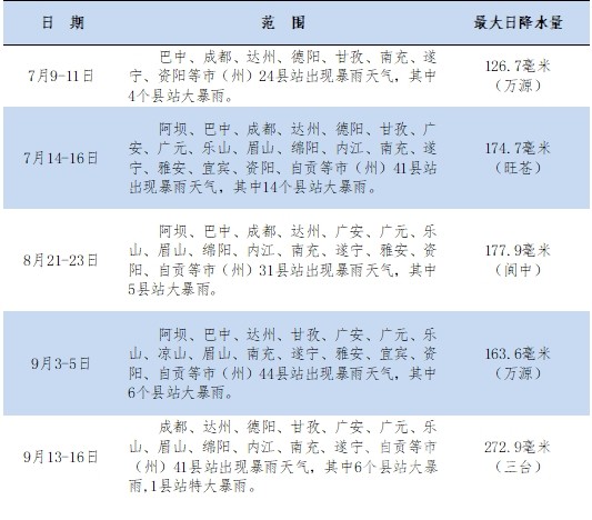 巴中、達(dá)州、廣安、南充、遂寧、資陽、內(nèi)江和綿陽8市有15縣站突破本站年降水量歷史最多記錄。