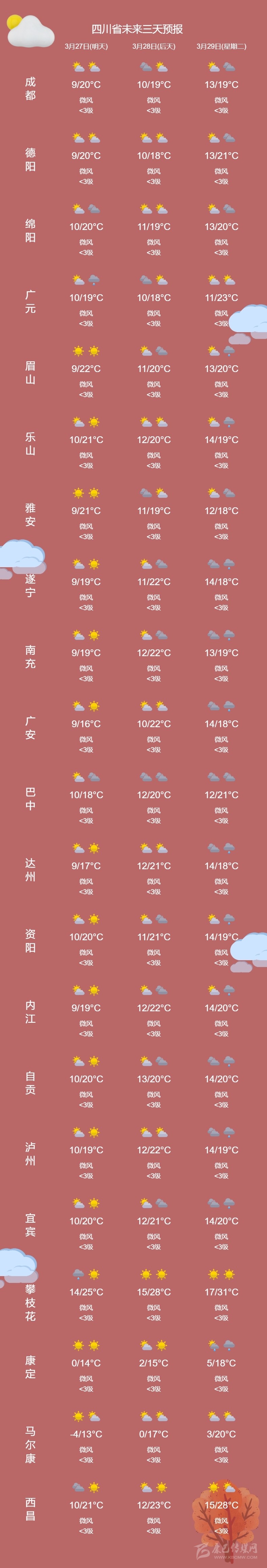 預(yù)計(jì)28~29日盆地大部多云,局部陣雨,川西高原和攀西地區(qū)晴間多云;30日~4月2日我省有一次降溫、降水天氣過(guò)程,其中盆地大部和攀西地區(qū)及川西高原東部南部有小到中雨,局部大雨。