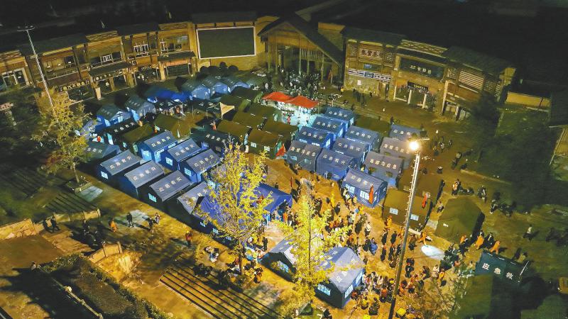 20時(shí)10分,救援隊(duì)伍終于抵達(dá)磨西鎮(zhèn),在磨西廣場安置點(diǎn),第一盞燈剛好亮起。