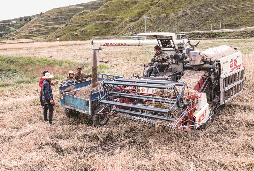深秋時節(jié),瑪曲草原一片金黃,清澈的黃河蜿蜒而過。甘肅省甘南藏族自治州瑪曲縣沃特村黨支部書記加華旦增正組織群眾將牛羊趕往過冬的牧場。