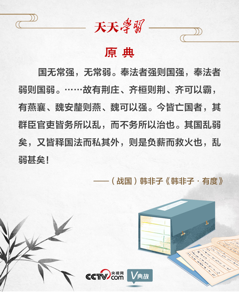 韓非子是戰(zhàn)國時期法家思想的集大成者?!坝卸取保褪怯蟹ǘ?。韓非子把“奉法”作為治亂興亡的關(guān)鍵,提出“國無常強,無常弱。奉法者強則國強,奉法者弱則國弱”。意思是,國家不會永遠富強,亦不會長久貧弱。執(zhí)行法度的人堅決,國家就會富強;執(zhí)行法度的人軟弱,國家就會貧弱。