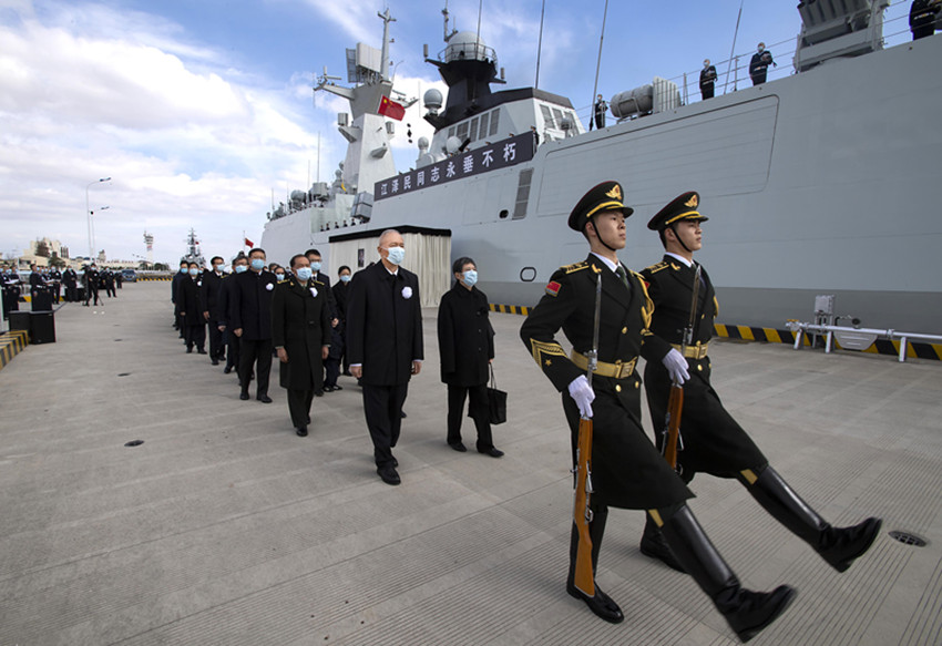 中國人民解放軍海軍揚州艦伏波靜臥,艦上官兵分區(qū)列隊、肅立舷邊。揚州是江澤民同志的故鄉(xiāng)。今天,這艘以揚州命名的軍艦,以最高禮儀送別這位為黨和人民建立了不朽功勛的卓越領(lǐng)導(dǎo)人。江澤民同志的親屬捧護著骨灰登上揚州艦。海軍笛吹響,儀仗隊持槍肅立,行注目禮。當(dāng)揚州艦起航時,軍港內(nèi)所有艦船汽笛長鳴,響徹云霄。