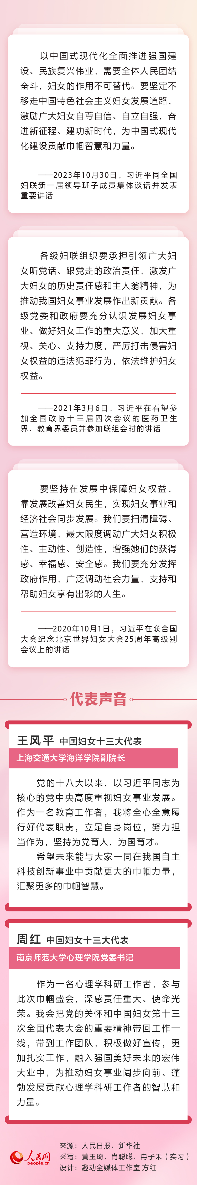 黨的十八大以來,以習(xí)近平同志為核心的黨中央從黨和國家事業(yè)發(fā)展全局出發(fā),高度重視和積極推進(jìn)婦女工作,加強(qiáng)黨對(duì)婦女工作的領(lǐng)導(dǎo),堅(jiān)持中國特色社會(huì)主義婦女發(fā)展道路,部署婦聯(lián)改革任務(wù),發(fā)揮婦女在各個(gè)方面的積極作用,推動(dòng)我國婦女事業(yè)取得歷史性成就。人民網(wǎng)帶您重溫習(xí)近平總書記重要論述并邀請(qǐng)中國婦女十三大代表解讀。