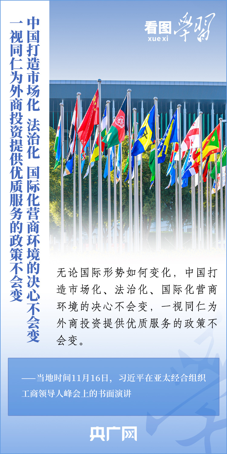 當(dāng)?shù)貢r(shí)間11月16日,國(guó)家主席習(xí)近平應(yīng)邀出席亞太經(jīng)合組織工商領(lǐng)導(dǎo)人峰會(huì)并發(fā)表書面演講。習(xí)主席深刻總結(jié)了亞太經(jīng)濟(jì)合作30年來非凡成就和啟示,對(duì)亞太合作下一個(gè)30年將走向何方這一新的時(shí)代之問提出中國(guó)答案,重申“中國(guó)打造市場(chǎng)化、法治化、國(guó)際化營(yíng)商環(huán)境的決心不會(huì)變,一視同仁為外商投資提供優(yōu)質(zhì)服務(wù)的政策不會(huì)變”,向全球工商界發(fā)出邀請(qǐng),歡迎“積極參與中國(guó)式現(xiàn)代化進(jìn)程,共享中國(guó)高質(zhì)量發(fā)展帶來的巨大機(jī)遇!”一起來學(xué)習(xí)。