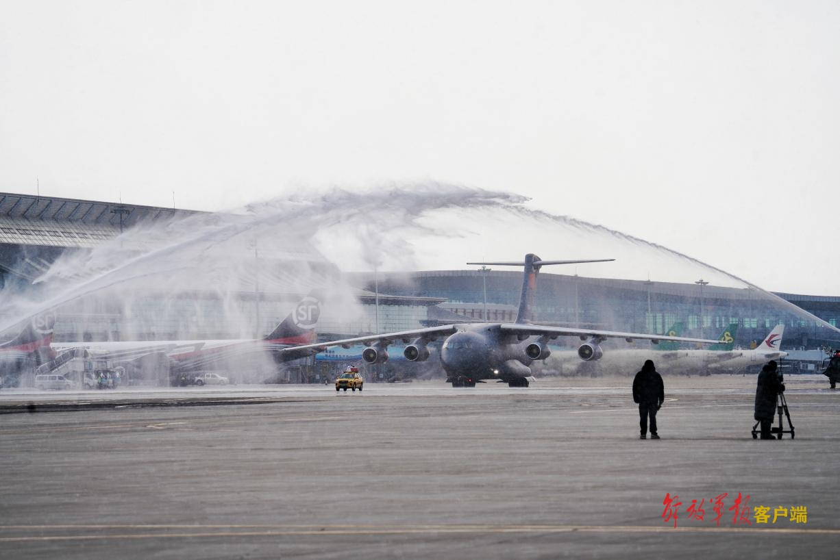 滑行時(shí),兩道水柱從跑道兩側(cè)的消防車中噴射而出,它們?cè)趻佄锞€最高點(diǎn)相遇,一道“水門”傾瀉而下,為搭載志愿軍烈士遺骸的運(yùn)-20專機(jī)接風(fēng)洗塵。