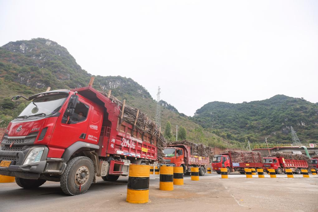 近日,在廣西來賓市一糖廠,裝滿甘蔗的車輛正排隊(duì)入廠。新華社記者 胡星宇 攝