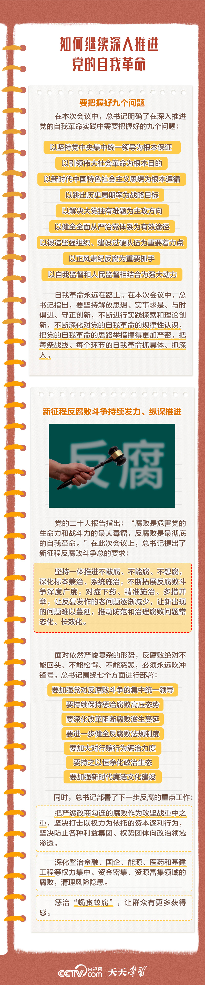 勇于自我革命是我們黨最鮮明的品格和最大的優(yōu)勢,總書記多次對推進黨的自我革命作出重要部署。此次會議上,總書記深刻闡述了黨的自我革命的重要思想,明確提出需要把握好九個問題,并對持續(xù)發(fā)力、縱深推進反腐敗斗爭作出戰(zhàn)略部署。央視網(wǎng)《天天學(xué)習(xí)》與您一起學(xué)習(xí)。